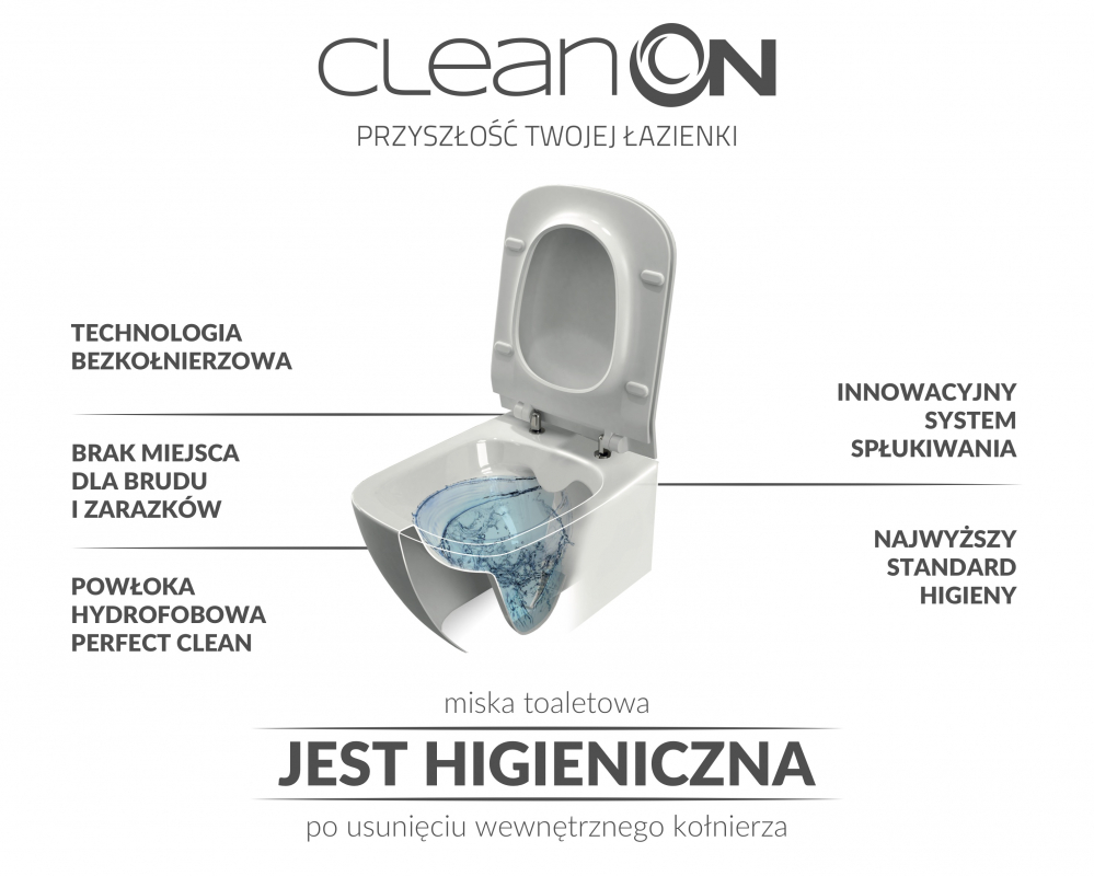 - Z innowacyjną technologią CleanOn, dzięki której toaleta pozostaje bardziej czysta i bezpieczna na dłużej