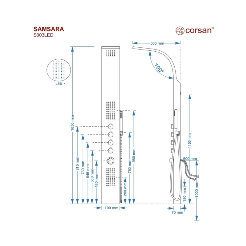 Corsan Samsara Panel prysznicowy z deszczownicą LED grafit szczotkowany S003MGMLED
