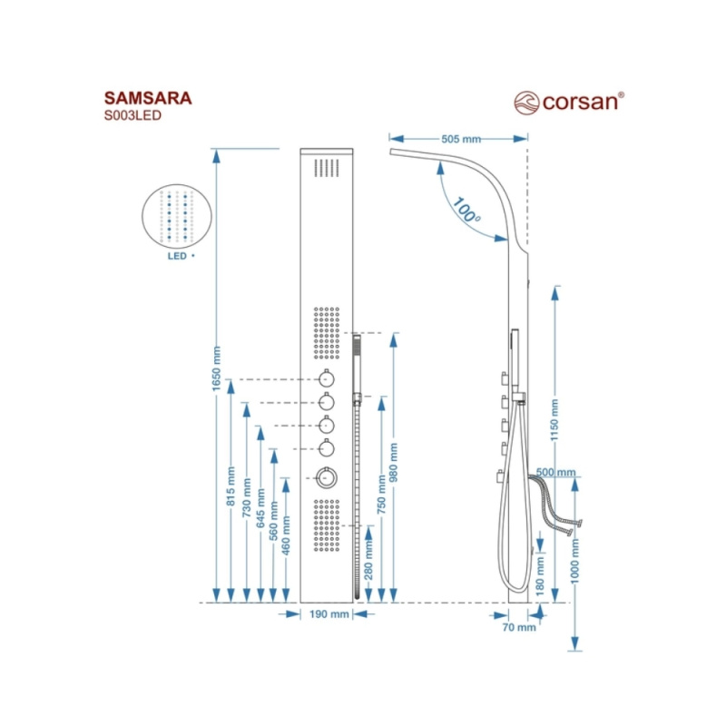 Corsan Samsara Panel prysznicowy z deszczownicą LED stal szczotkowana S003MSLLED