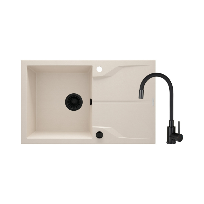 Deante Andante Zestaw Zlewozmywak granitowy jednokomorowy 78x49 cm beż + bateria kuchenna czarny mat ZQNN5113