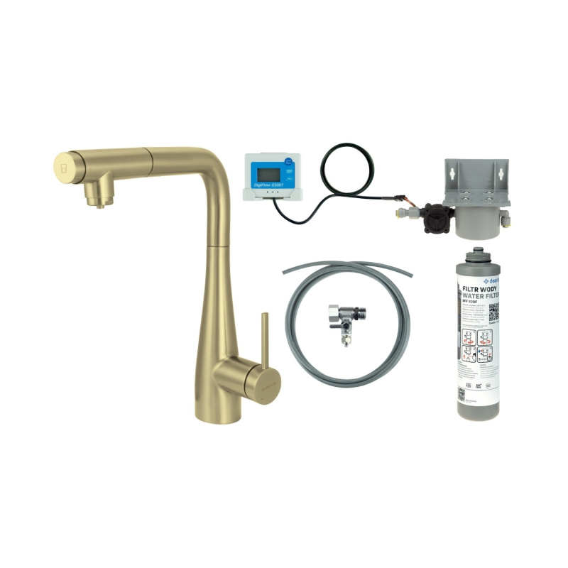 Deante Eridan Bateria kuchenna z wyciąganą wylewką z filtrem złoto szczotkowane BREFR75M