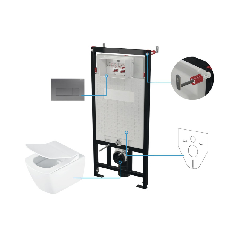 Opis produktu Deante Hiacynt New Zestaw Toaleta WC bez kołnierza krótka biała + deska wolnoopadająca + stelaż WC + przycisk WC titanium mat + mata + wsporniki CDYT6ZPW