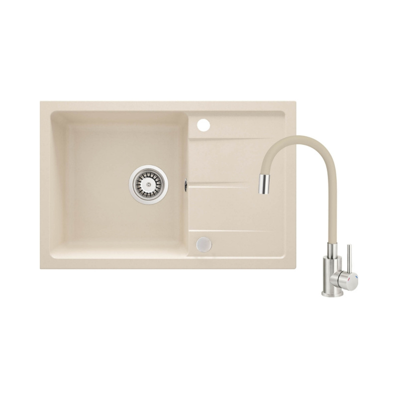 Deante Leda Zestaw Zlewozmywak granitowy jednokomorowy 67x44 cm beż + bateria kuchenna chrom ZRDG5113