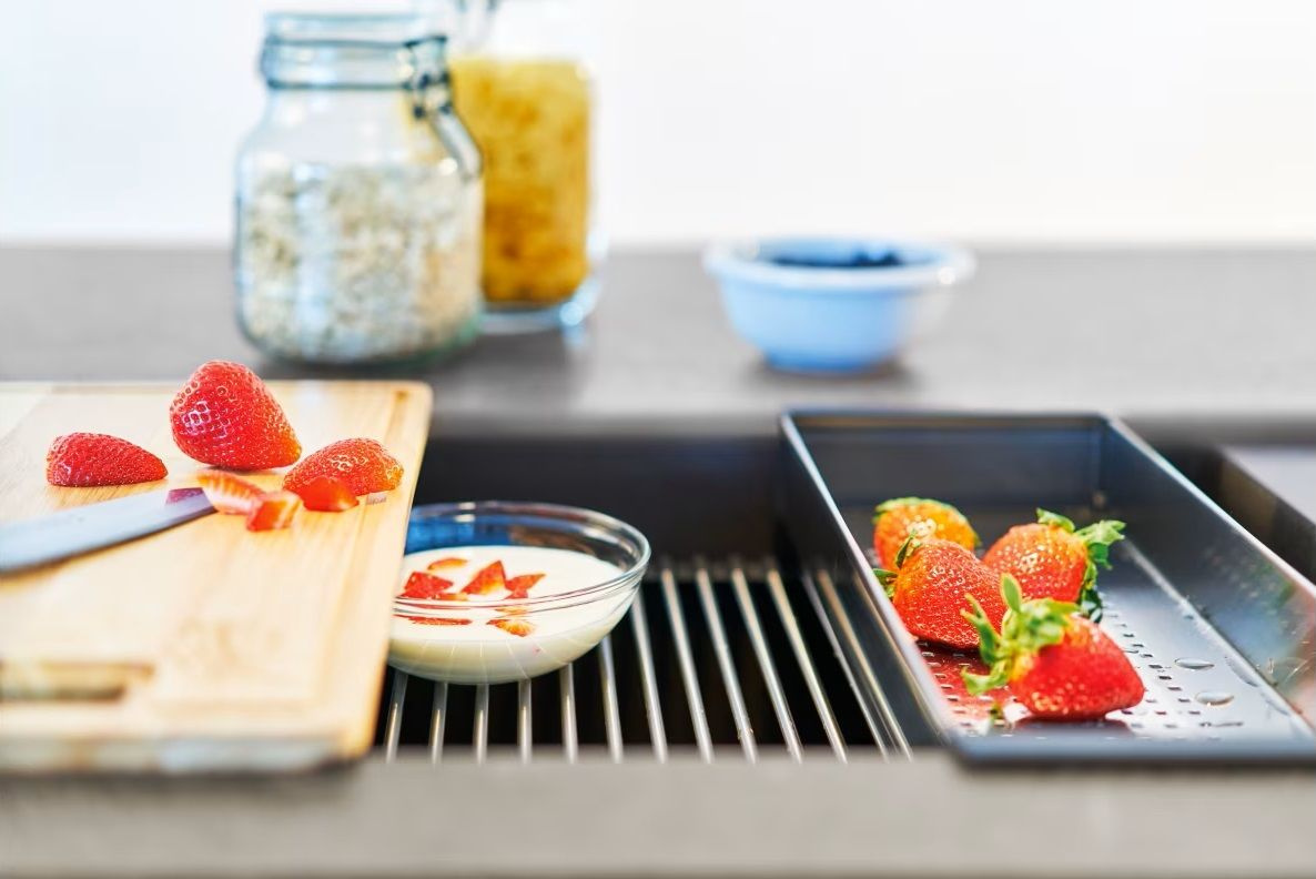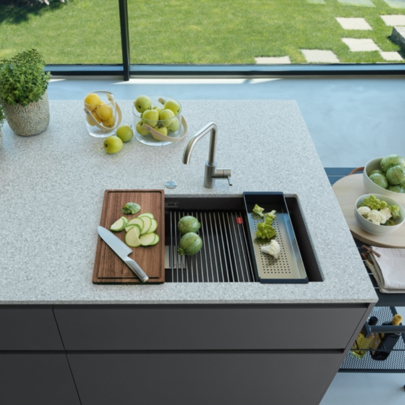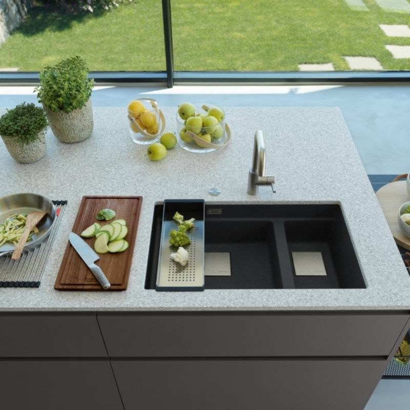 Czyszczenie zaschniętych naczyń i opłukiwanie talerza to jedno. W komorach zlewu jeszcze zmywasz brud z chrupiących liści sałaty, napełniasz wazon na kwiaty, a na blacie obok siekasz warzywa do sałatki i kroisz piersi indyka. Żeby ta strefa była maksymalnie praktyczna, marka FRANKE stworzyła zestaw ALL-IN, czyli komplet akcesoriów przydatnych podczas codziennych i niecodziennych obowiązków. To rozwiązania, które ułatwią nie tylko sprzątanie, lecz także przyspieszą gotowanie – tym samym zlewozmywak stanie się wygodnym miejscem pracy! Co znajduje się w zestawie FRANKE ALL-IN? W zależności od wariantu do wyboru masz 8 elementów; teleskopową szynę, bambusową deskę do krojenia, dużą i małą wkładkę ociekową, mały i duży pojemnik, bambusową pokrywkę oraz silikonową podkładkę, na którą możesz odłożyć garnki i patelnie pełne gorących zup, sosów oraz mięs. Cały system wyróżnia minimalistyczny design, który dyskretnie wtopi się w przestrzeń mycia.