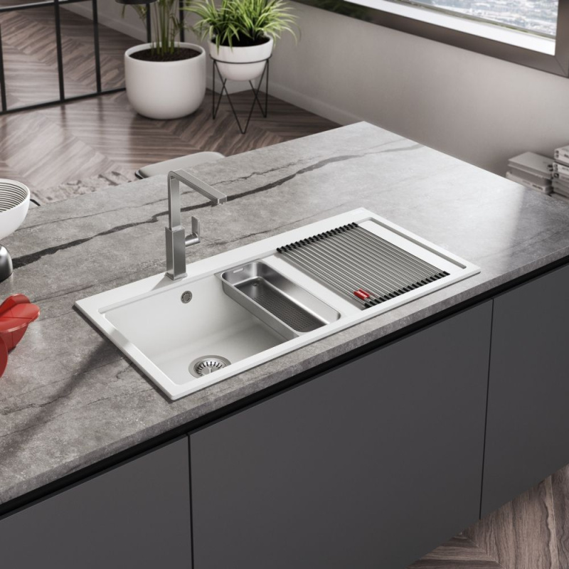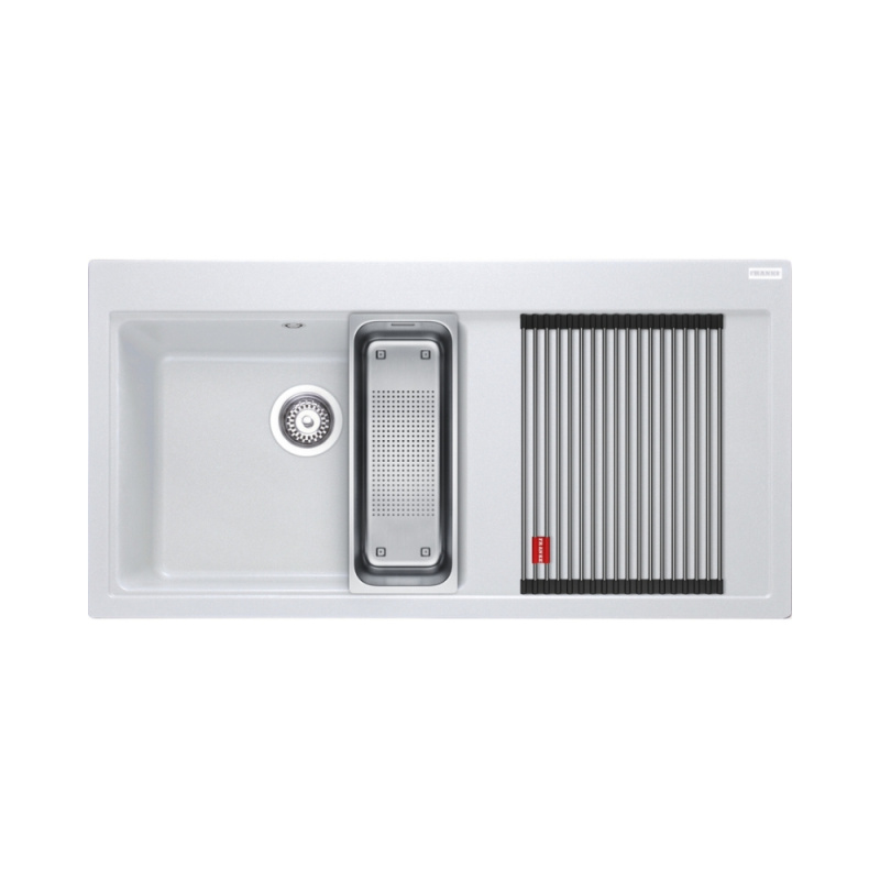 Opis produktu Franke Mythos MTG 611-100 Zestaw Zlewozmywak granitowy jednokomorowy 100x51,5 cm lewy + wkładka ociekowa + rollmata biały polarny 114.0743.110