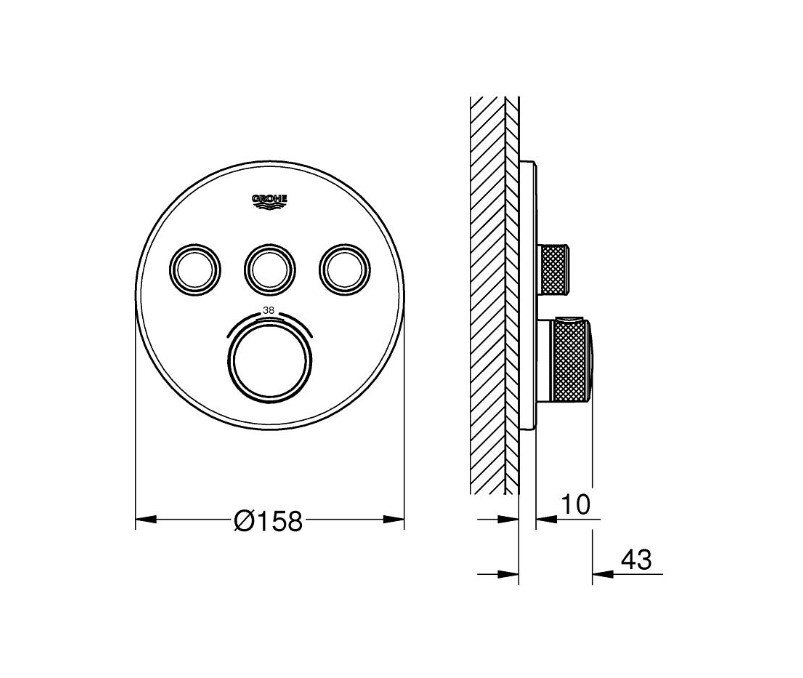 - Metalowa rozeta ścienna z GROHE FastFixation (zakryte uszczelnienie rozety i mocowania trzpienia), regulacja 6°