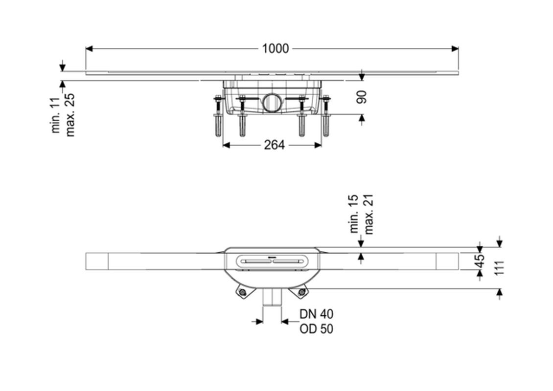 - Korpus z PP jest wyposażony w kołki montażowe dźwiękochłonne, które redukują hałas związany z pracą urządzenia i mogą kompensować osiadanie konstrukcji podłogi