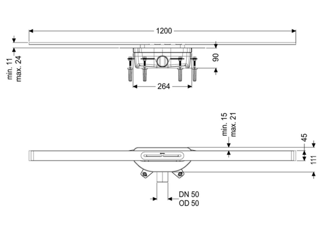 - Rynna zawiera kołnierz zatrzaskowy z fabrycznie zamontowaną matą hydroizolacyjną zgodnie z normami DIN EN 1253-1 i DIN 18534-1-W3-I