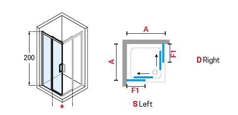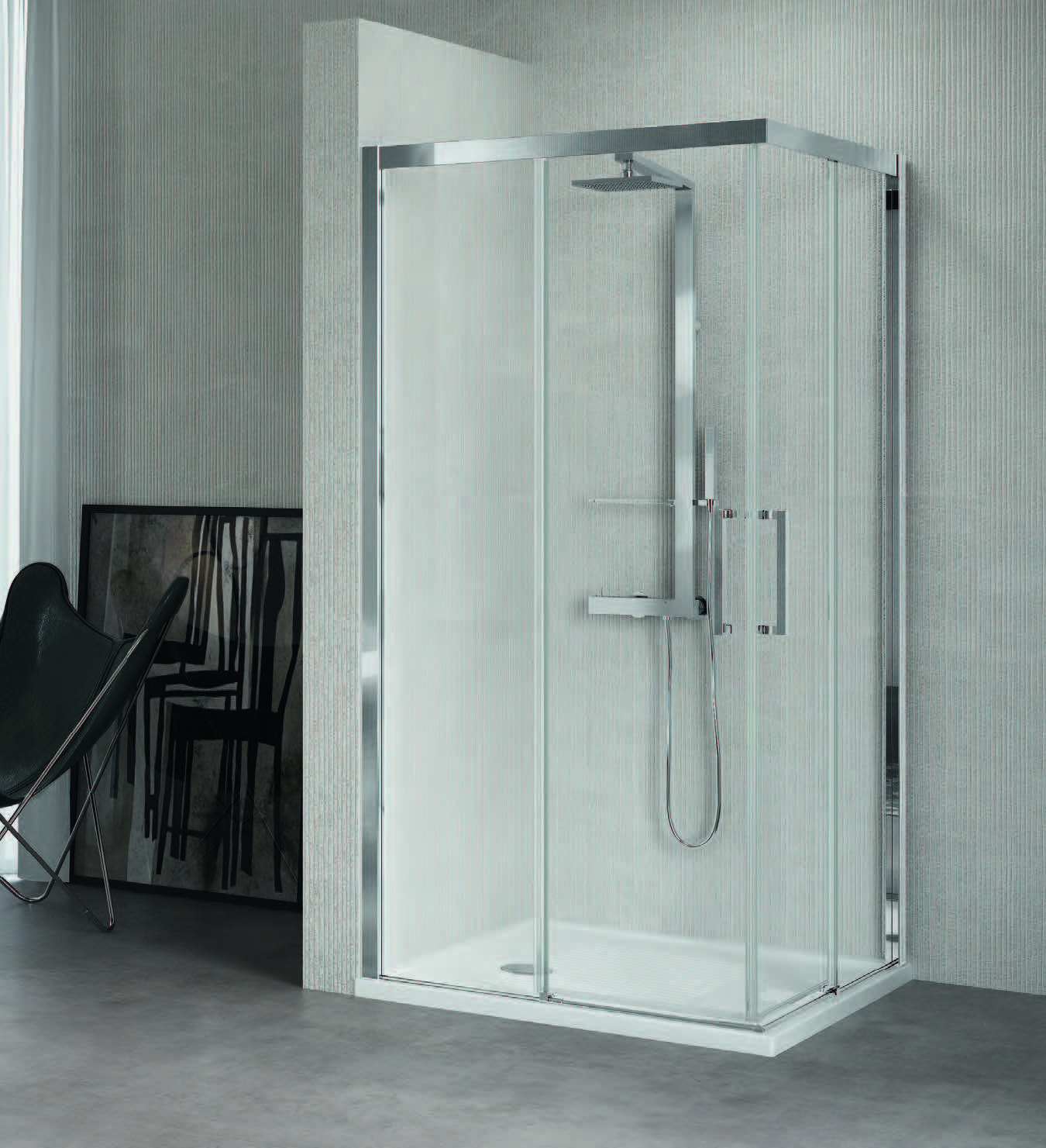 Kompletna kabina narożna składa się z 2 drzwi przesuwnych i dwóch pól stałych. Do kompletnej kabiny narożnej trzeba zamówić 2 strony - prawą i lewą.