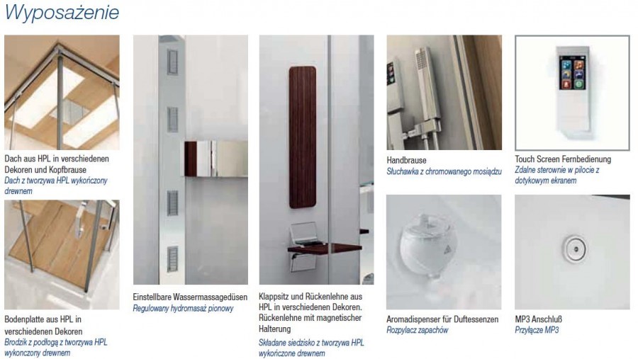 - Sauna plus (sauna parowa, aromaterapia, radio FM RDS stereo, podłączenie do MP3, chromoterapia)