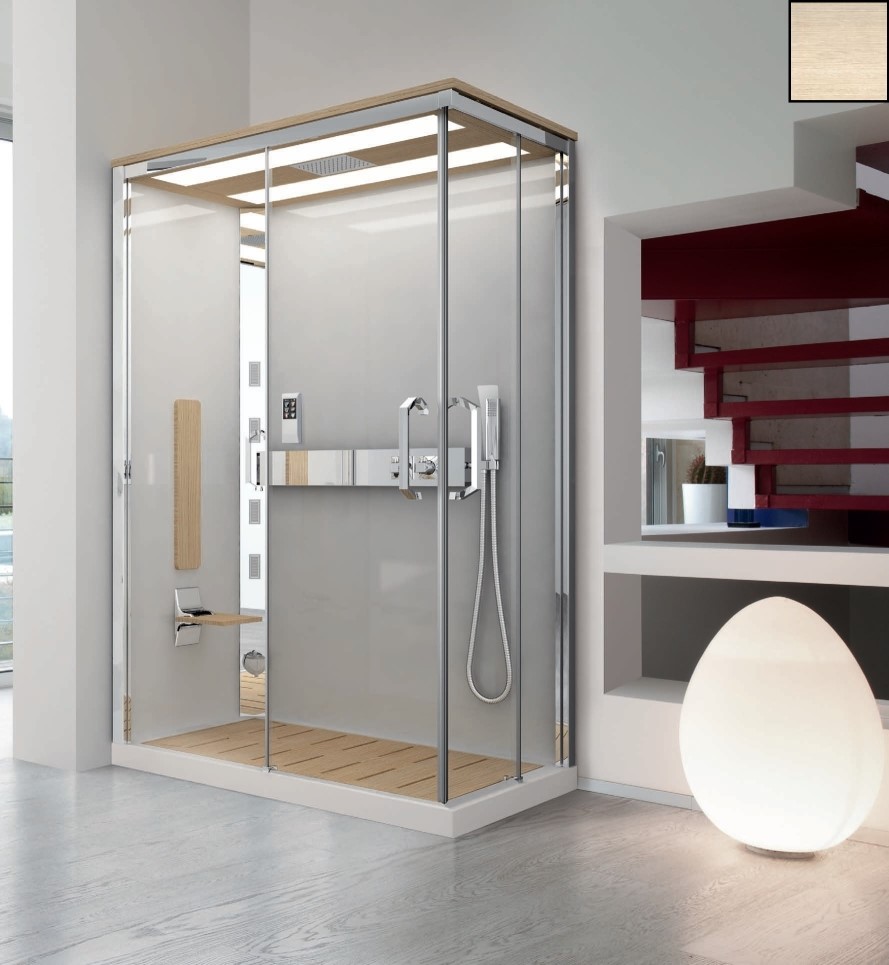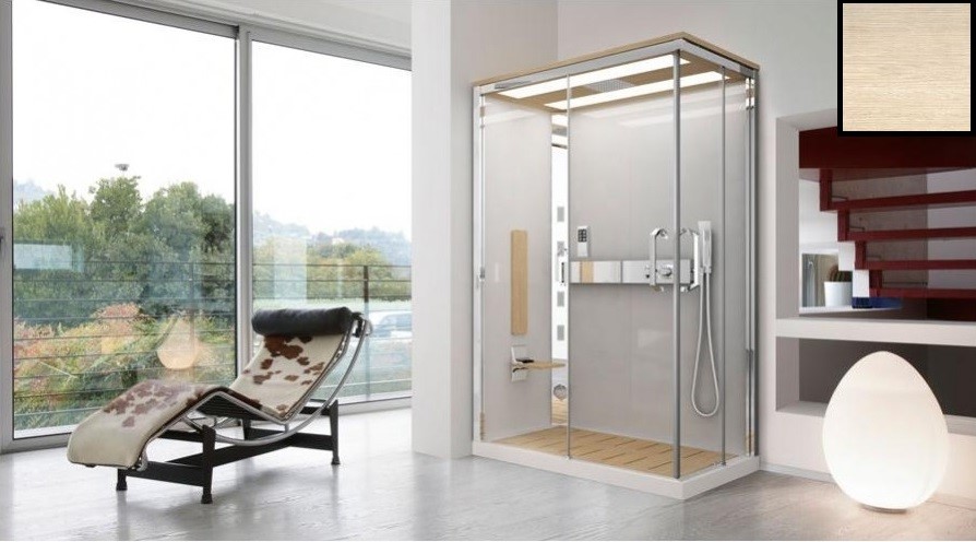 Opis produktu Novellini Nexis A Kabina prysznicowa prostokątna z dachem, sauną i deszczownicą 120x80x227 cm, lewa, profile chrom, szkło przezroczyste, wykończenie białe z fakturą drewna NEXA120ST5-1KQ