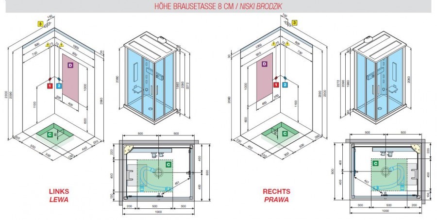 - Wysokość kabiny 227 cm w tym brodzik 8 cm