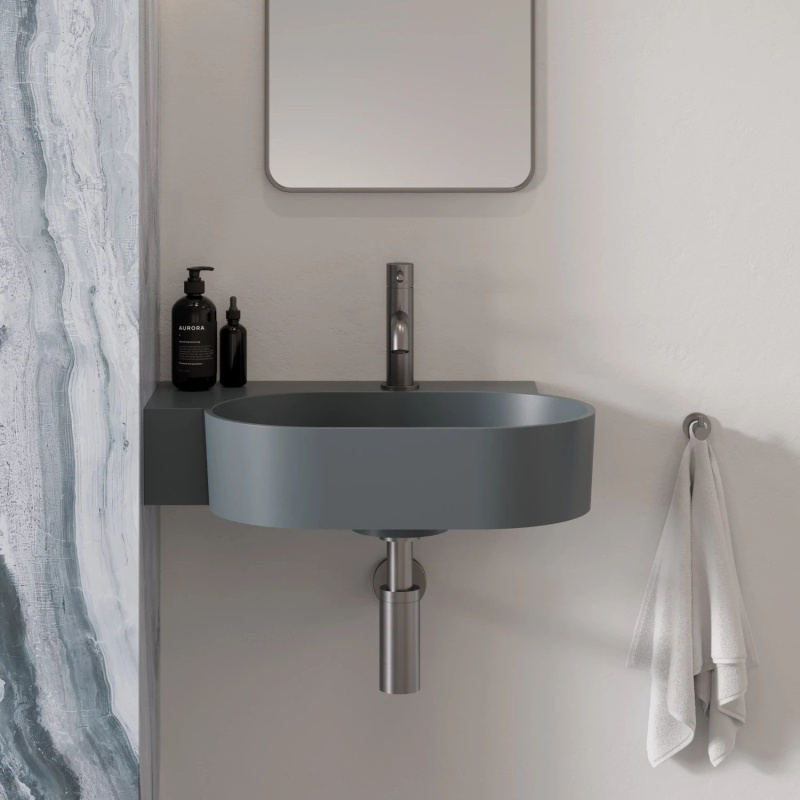 - OVO w kolorze ash grey (RAL7022) to umywalka w eleganckim odcieniu ciepłej szarości, o aksamitnej w dotyku, matowej powierzchni