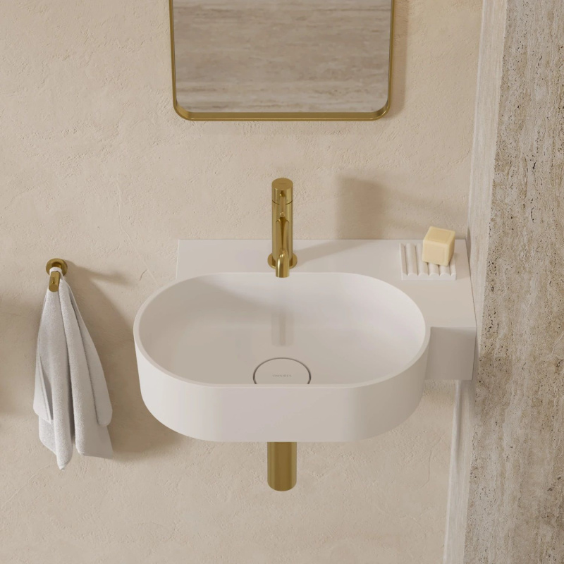 - Powstały z zabawy geometrią kształt tworzą dwa przeciwległe półokręgi umywalki, połączone z prostokątną, funkcjonalną półką – idealnym miejscem do montażu baterii, a także do odstawienia kosmetyków czy innych niezbędnych akcesoriów