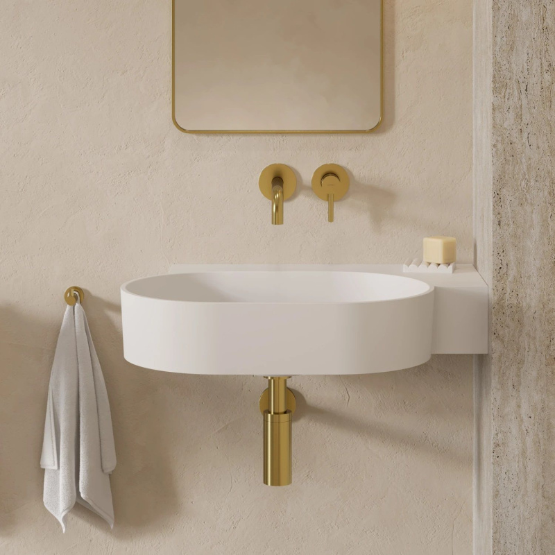- Powstały z zabawy geometrią kształt tworzą dwa przeciwległe półokręgi umywalki, połączone z prostokątną, funkcjonalną półką – idealnym miejscem do montażu baterii, a także do odstawienia kosmetyków czy innych niezbędnych akcesoriów