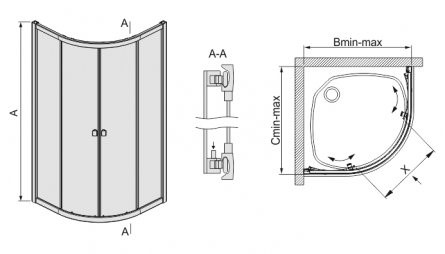 Kabina narożna półokrągła KP4/VE z drzwiami rozsuwanymi posiada wypełnienie z bezpiecznego szkła hartowanego o grubości 6 mm. System jezdny oparty jest o zespół podwójnych rolek łożyskowych mocowanych w tafli szkła oraz podwójnych odpinanych rolek dolnych. Szczelność zapewniają transparentne uszczelki na ściankach, drzwiach oraz uszczelka magnetyczna. Wygodne przesuwanie drzwi umożliwiają ergonomiczne, chromowane uchwyty. Regulowane profile przyścienne pozwalają na zniwelowanie krzywizny ściany. Modyfikacja powierzchni szkła Glass Protect w cenie produktu.