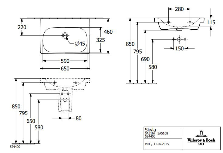 Opis produktu Villeroy & Boch Skyla Umywalka meblowa 65x46 cm bez otworu na baterię z przelewem biały Weiss Alpin 5A516701