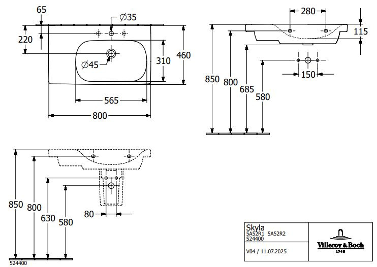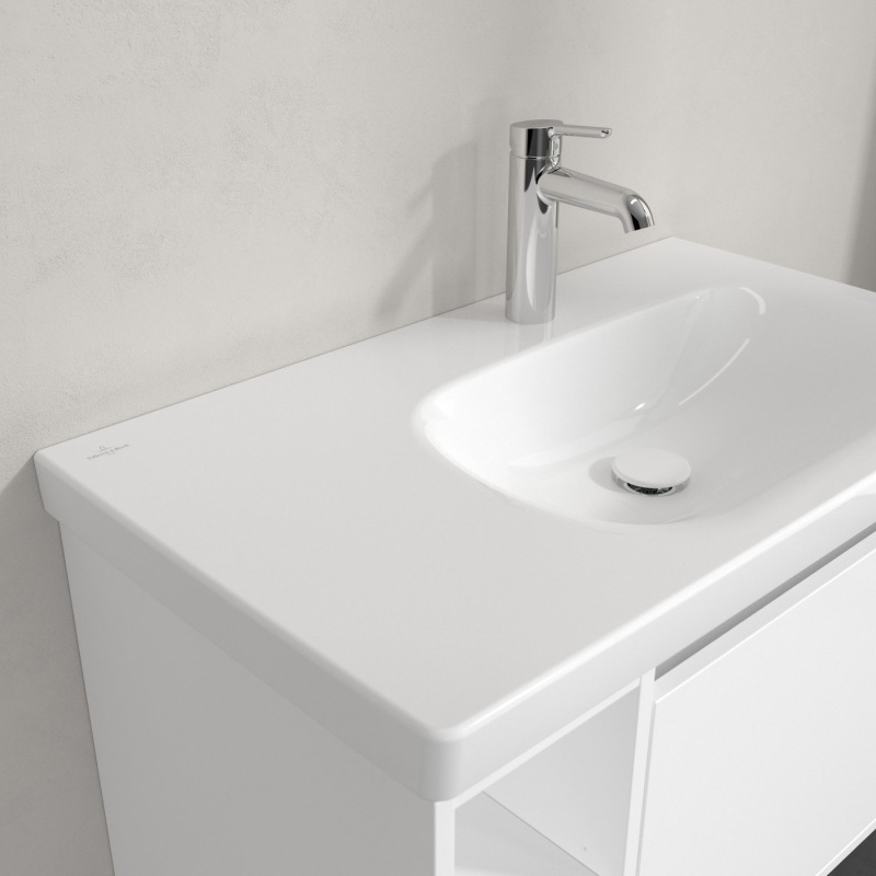 Opis produktu Villeroy & Boch Skyla Umywalka meblowa 80x46 cm z otworem na baterię bez przelewu prawa biały Weiss Alpin z powłoką CeramicPlus 5A52R2R1