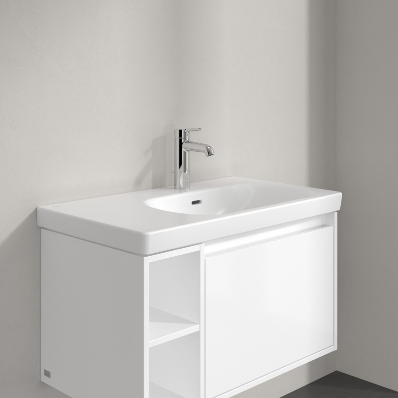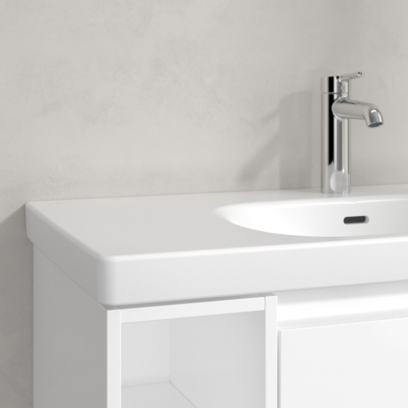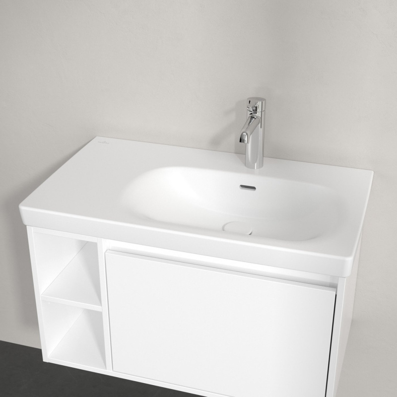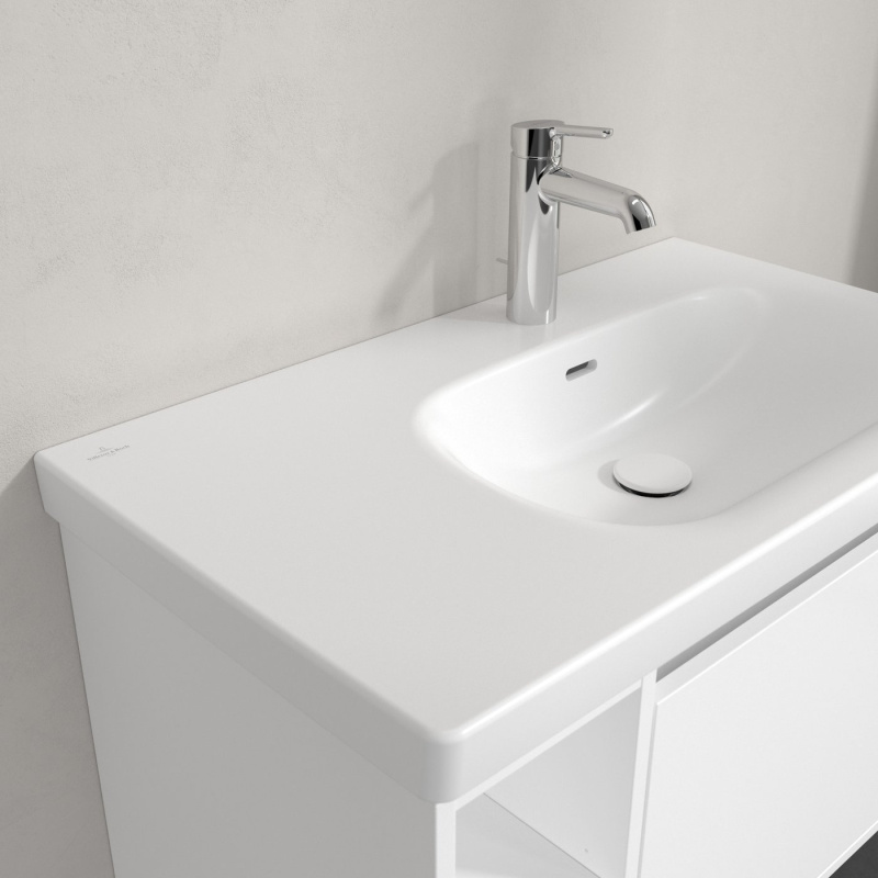 Opis produktu Villeroy & Boch Skyla Umywalka meblowa 80x46 cm z otworem na baterie z przelewem prawa biały mat Stone White z powłoką CeramicPlus 5A52R1RW