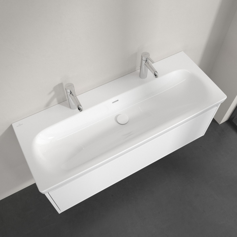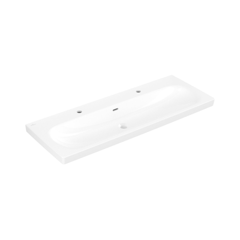 Opis produktu Villeroy & Boch Skyla Umywalka meblowa 120x46 cm podwójna z dwoma otworami na baterie z przelewem biały Weiss Alpin z powłoką CeramicPlus 5A51C4R1