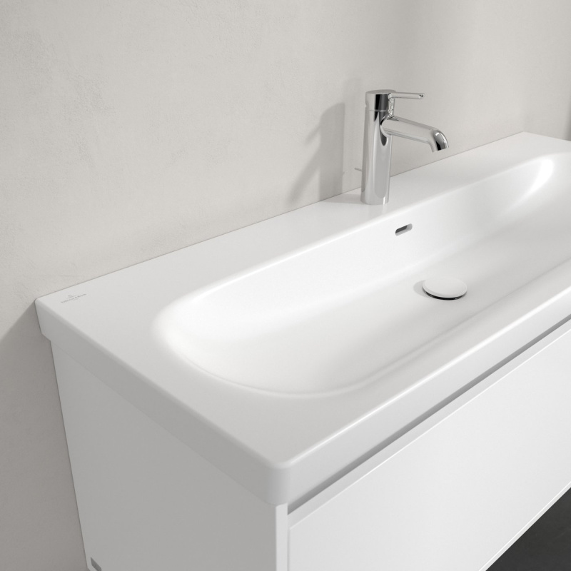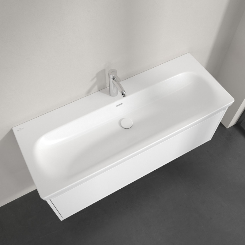 Opis produktu Villeroy & Boch Skyla Umywalka meblowa 120x46 cm podwójna z jednym otworem na baterie z przelewem biały mat Stone White z powłoką CeramicPlus 5A51C5RW