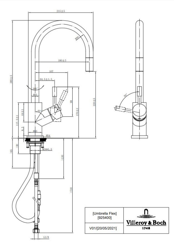 Opis produktu Villeroy & Boch Umbrella Flex Bateria kuchenna wysoka z wyciąganą wylewką czarny mat 92540006
